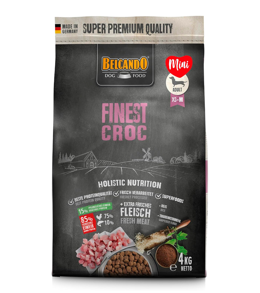 Materias primas especialmente seleccionadas, el sabroso pato y el hígado hacen de BELCANDO Finest Croc la primera opción para perros adultos de paladares exquisitos. El arroz, de muy fácil digestión, y la valiosa harina de semilla de uva prensada en frío hacen que la hora de comida sea un placer muy saludable en todos los sentidos. Un alto contenido en proteínas y grasas favorece la digestión y reduce el volumen fecal. Salsa : cuando se mezcla con agua caliente, se forma una salsa sabrosa.
