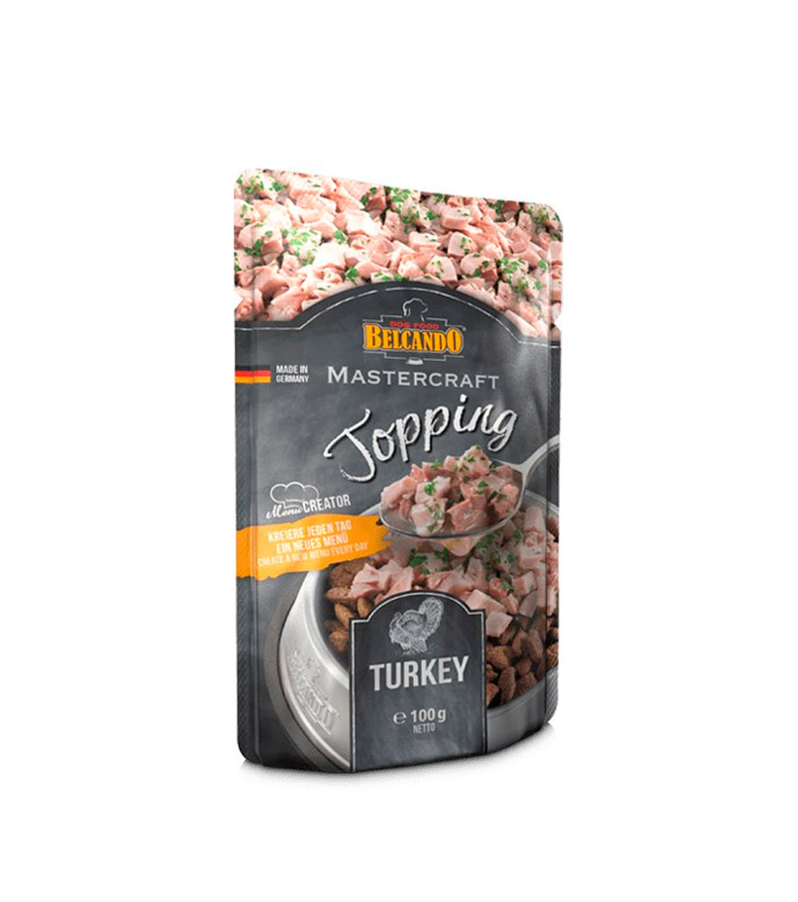 BELCANDO® MASTERCRAFT Topping Turkey es un alimento húmedo para perros delicioso. El complemento ideal para el menú de alimento seco de tu perro. Los trozos de pavo fresco se cuecen laboriosamente en su propio jugo y las verduras les dan el toque final. Por eso tienen una menor densidad energética que la comida húmeda clásica. Los toppings son “alimentos complementarios del pienso seco“. Sabroso, fresco y jugoso.