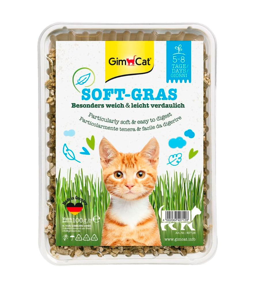 Hierba de GimCat Soft con fresco aroma a pradera, de plantación controlada, da vida a hierba especialmente tierna y rica en vitaminas en tan solo de 5 a 8 días