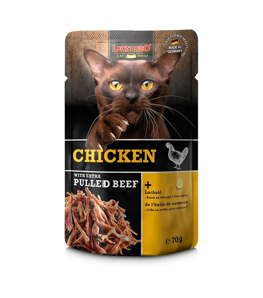 Leonardo Chicken + extra Pulled Beef es un delicioso paté de pollo combinado con carne desmenuzada, que ofrece a tu gato una experiencia de sabor única. Imagina una jugosa barbacoa o una hamburguesa con carne desmenuzada en tu restaurante favorito: la ‘experiencia de masticar’ y el sabor característico de la carne desmenuzada son simplemente inolvidables. Con el LEONARDO Pulled Beef, tu gato podrá disfrutar de esta experiencia especial en cada bocado. Cada porción es cocinada suavemente y enriquecida con aceite de salmón. El aceite de salmón suministra ácidos grasos poliinsaturados para un pelaje especialmente brillante y saludable.
