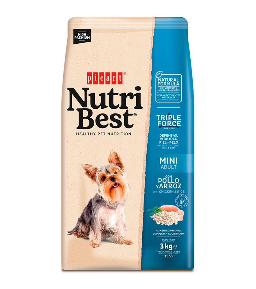 Nutribest Adult Mini con pollo y arroz es un alimento High Premium formulado por nuestros expertos en nutrición y veterinarios para que tu perro crezca sano y vital y disfrute de una salud óptima. Contiene Algas Marinas del Atlántico Norte para una piel y un pelo sanos y cuidados.