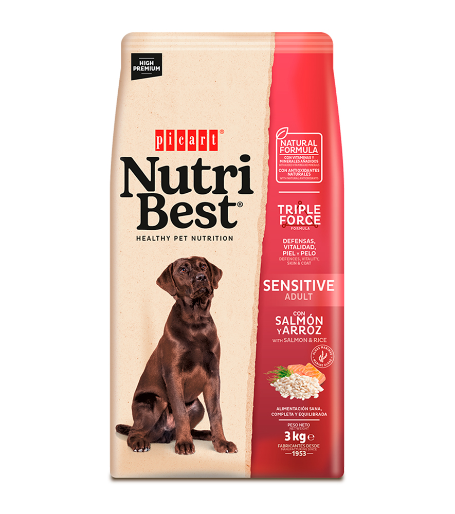 Nutribest Adult Sensitive con salmon y arroz es un alimento High Premium formulado por nuestros expertos en nutrición y veterinarios para que tu perro crezca sano y vital y disfrute de una salud óptima. Contiene Algas Marinas del Atlántico Norte para una piel y un pelo sanos y cuidados.