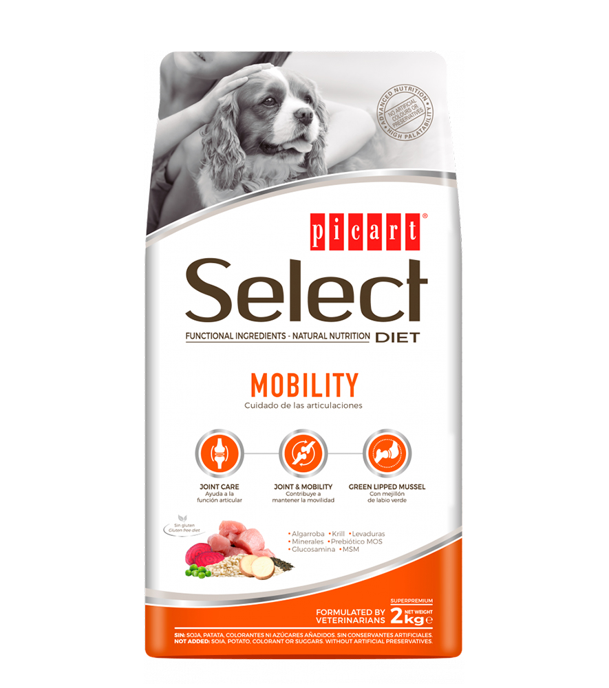 Picart Select Diet Mobility para perros es un alimento completo y equilibrado, elaborado con ingredientes de origen natural*, con vitaminas y minerales añadidos, indicado para perros con articulaciones delicadas, de todas las razas y en edad adulta. Contiene ingredientes funcionales que ayudan a conservar la salud de sus articulaciones y a cuidar su movilidad. Su moderado contenido en calorías favorece el mantenimiento de un peso idóneo para preservar las articulaciones protegidas de excesos.