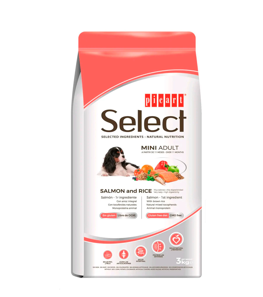 Picart Select MINI ADULT con salmón y arroz está formulado para satisfacer todas las necesidades de tu perro y promover una condición física y salud óptimas. El salmón, como única fuente de proteína animal, le aporta proteínas de alto valor biológico, e introduce variedad en la dieta.