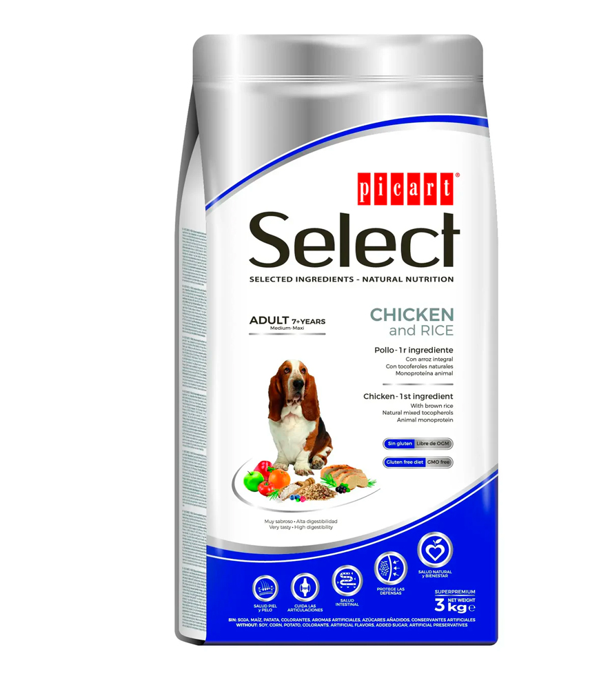 Picart Select Senior con pollo y arroz está formulado para satisfacer todas las necesidades de tu perro y promover una condición física y salud óptimas.