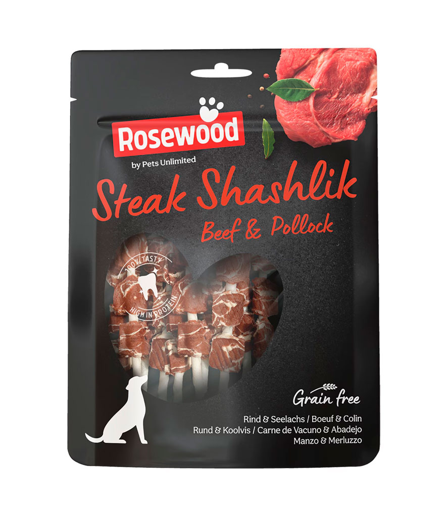 Snack para perros adultos medianos y grandes Steak Shashlik Rosewood ternera y bacalao 100 g